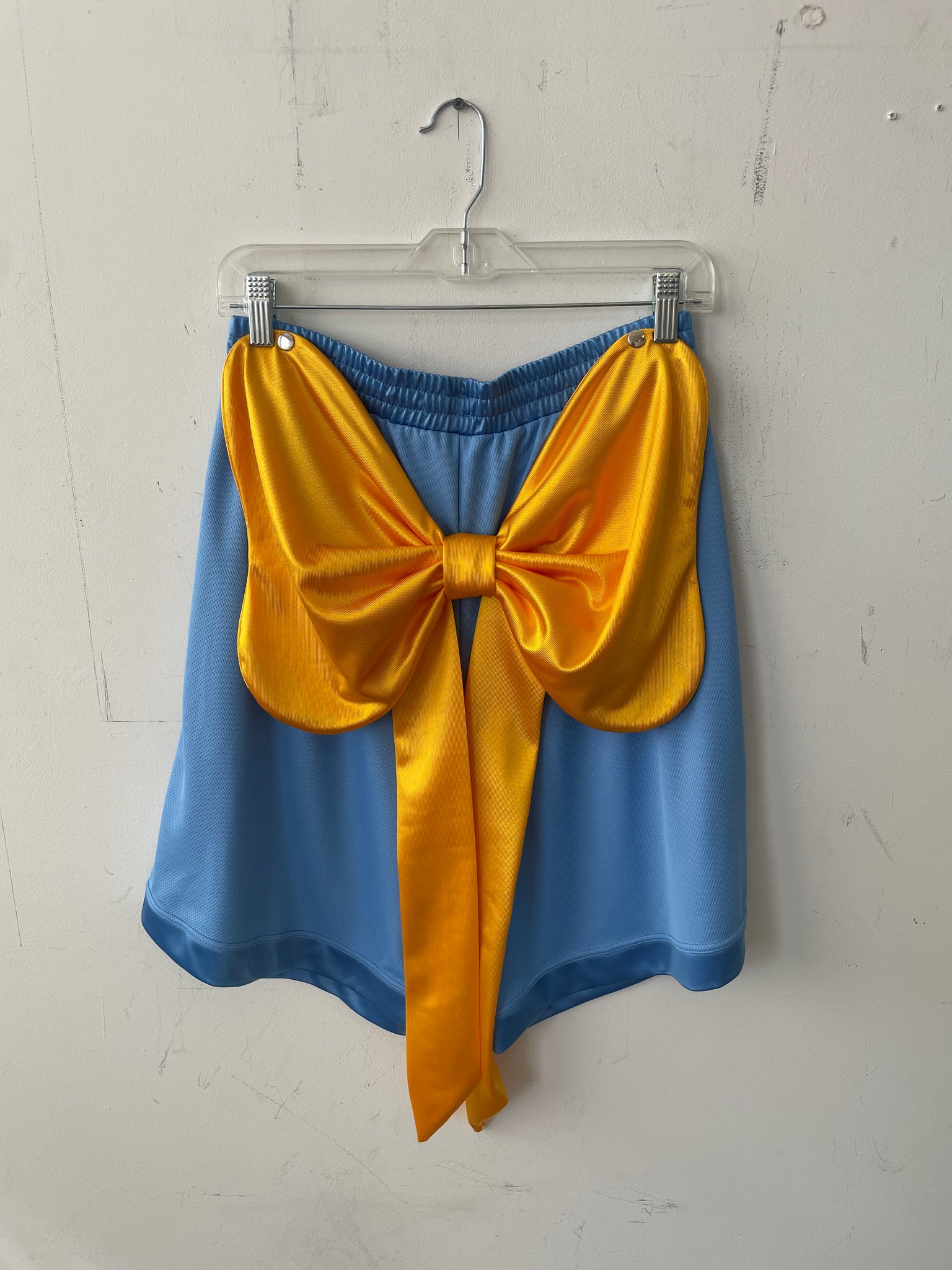 Shorts with detachable bow. 30” elastic waist. 20” long. Yellow bow also included