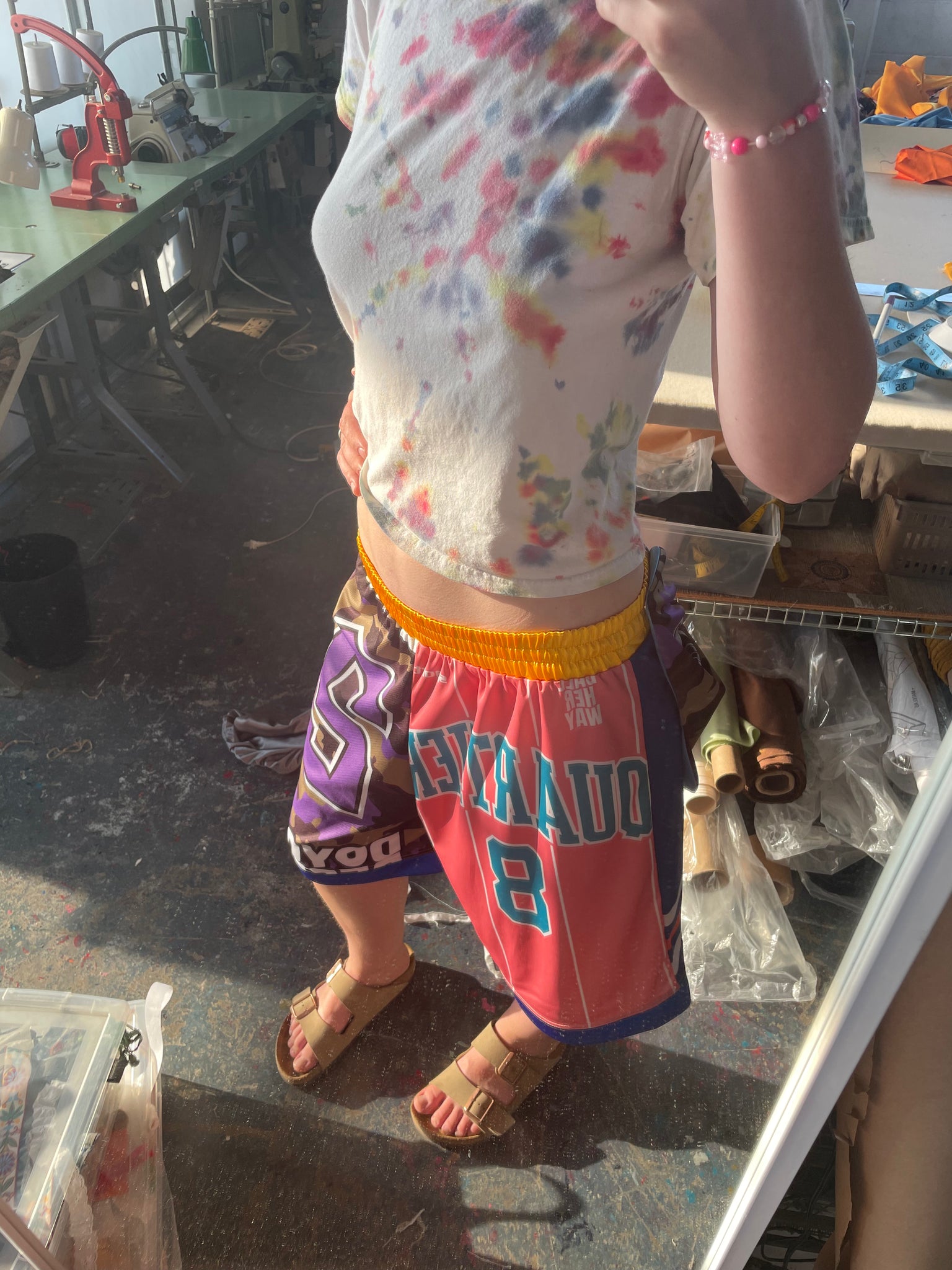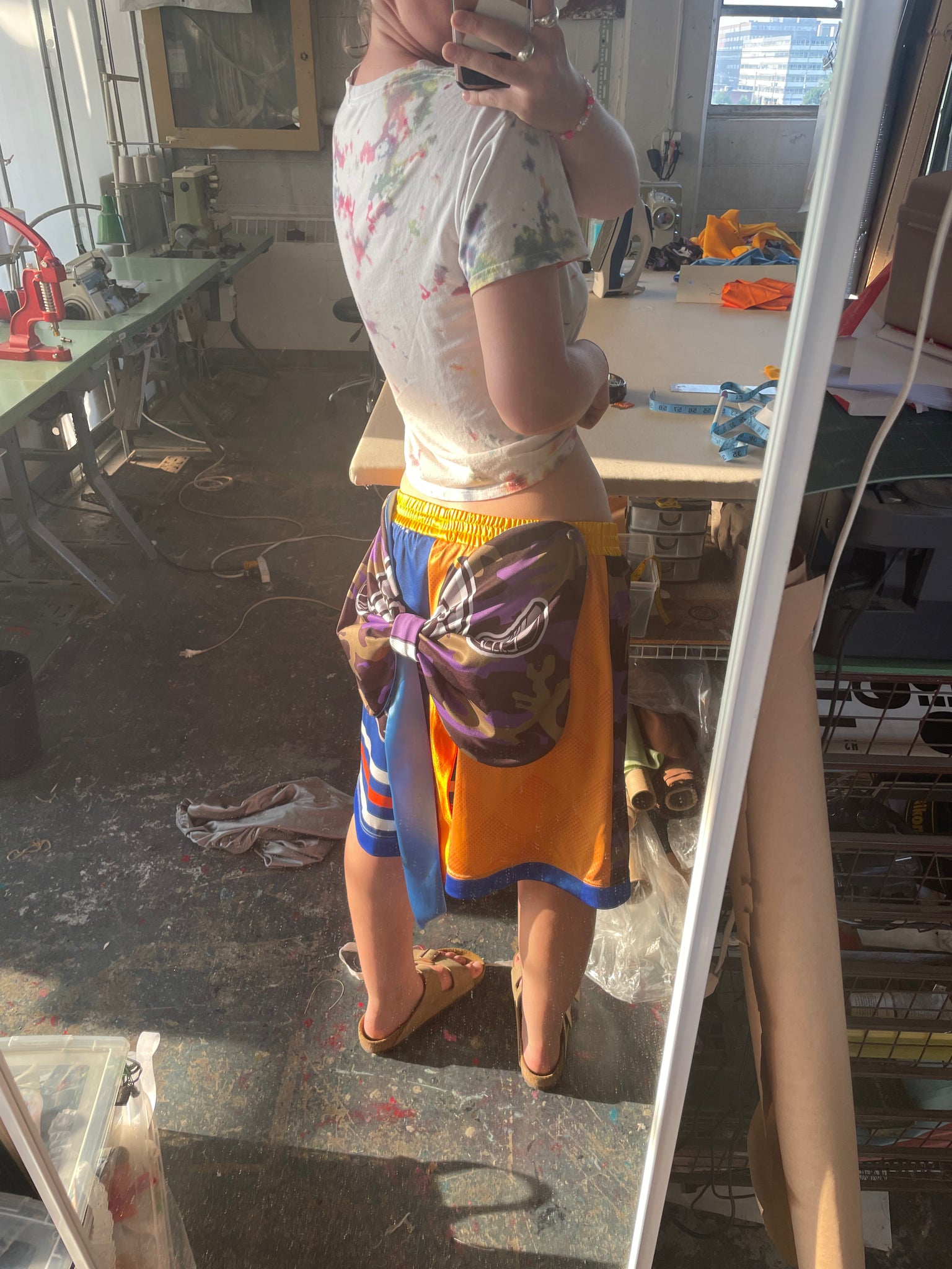 Classic boneless bow short but made with second hand jerseys. Removable bow. 30” elastic waist
