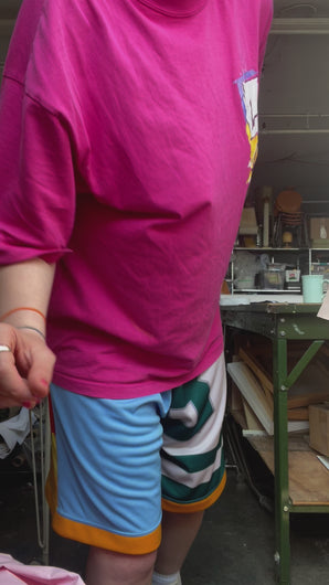 The classic boneless bow short but made with second hand sports jerseys! This is a one of a kind item. 30” elastic waist. Removable bow