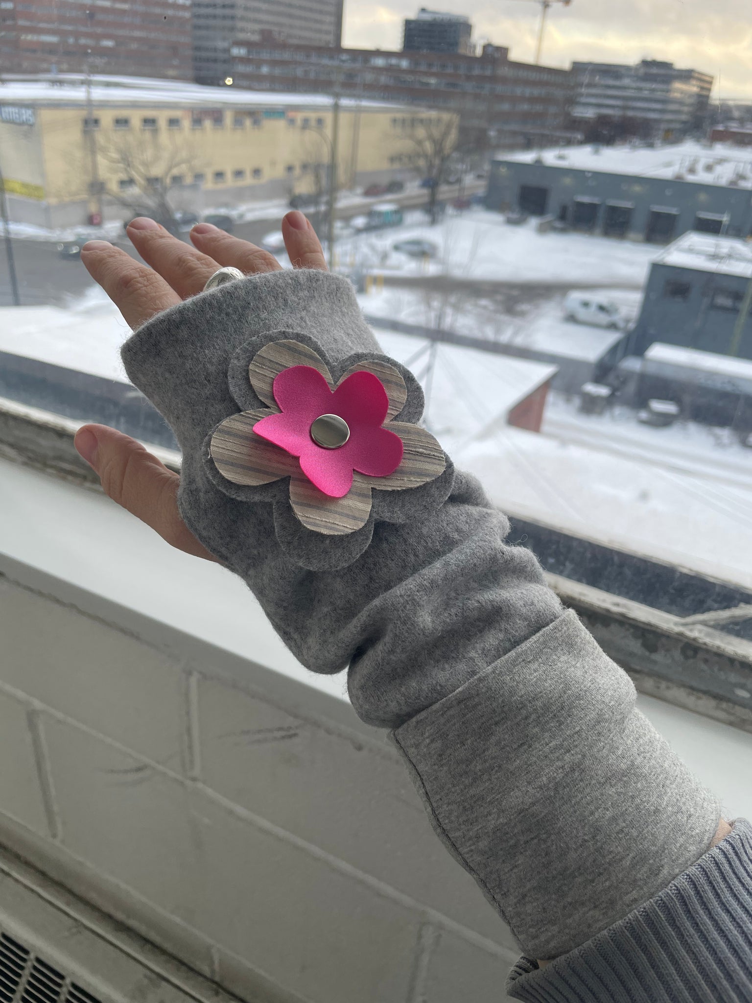 Wool gloves with cotton lining. Flower snaps on and off for easy washing. Medium, 4” wide and 10.5”long(with cuffs folded over). fabric has some stretch