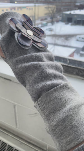Wool gloves with cotton lining. Flower snaps on and off for easy washing. Medium, 4” wide and 10.5”long(with cuffs folded over). fabric has some stretch