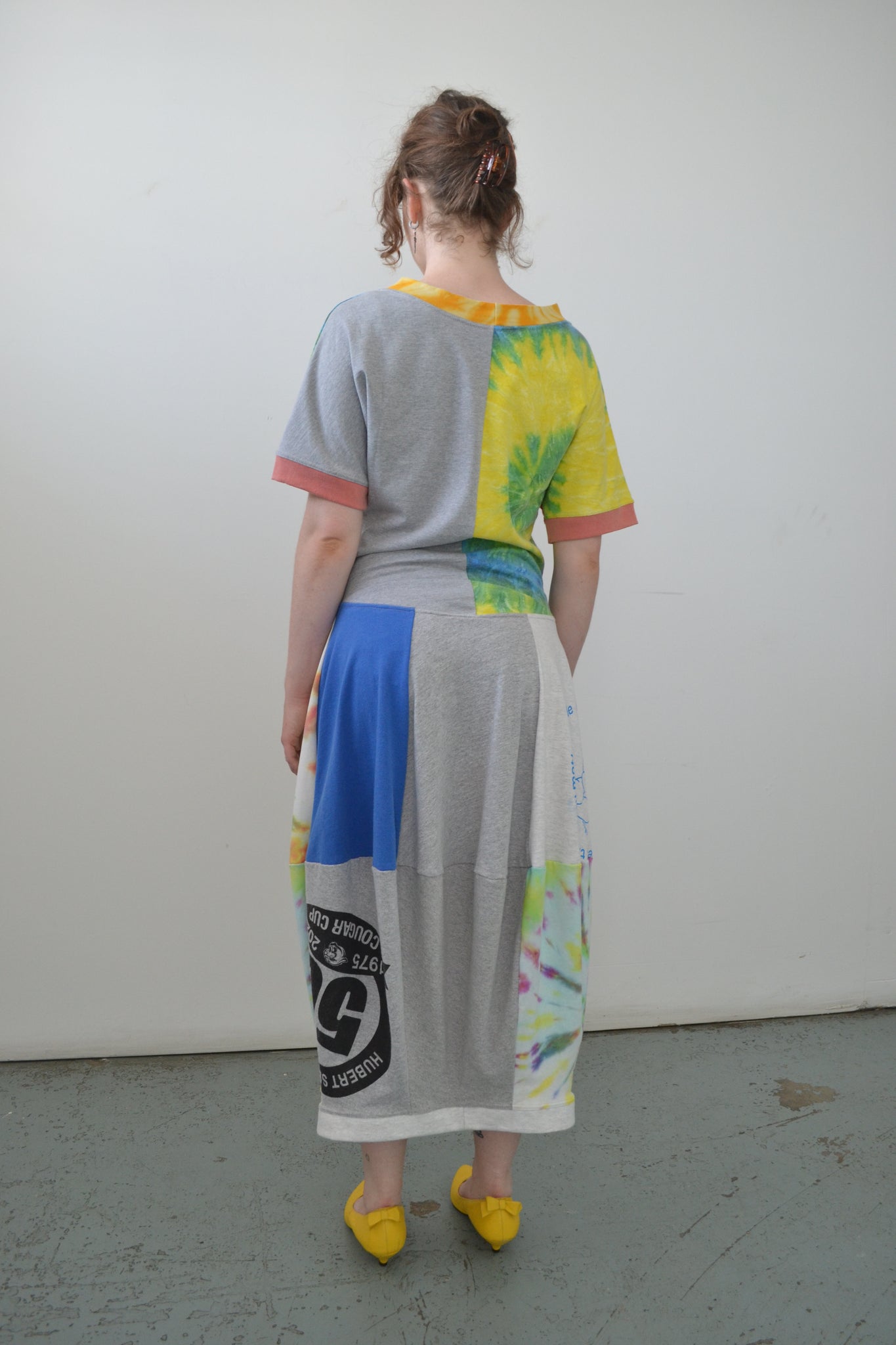 Dress made from second hand cotton t-shirts. I would consider this dress a medium, however It’s a stretchy cotton and can accommodate several sizes. The dress has lots of room in the bottom “balloon” portion of the dress and also in the shoulders and bust due to the dolman sleeves. Hips are 33” and the dress is 47” in length. Model is 5’3”