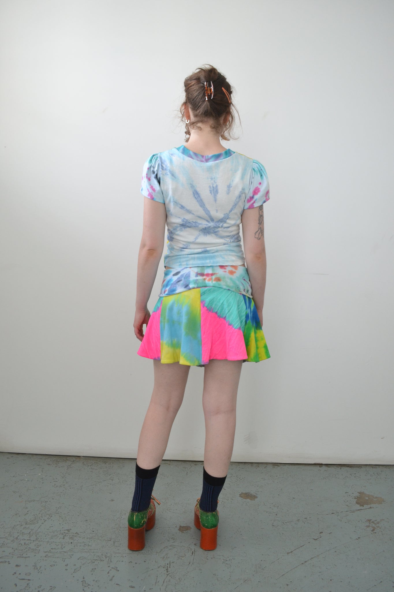 skirt made from second hand tie dyed cotton t-shirts. 29" waist (has some stretch), 14" long